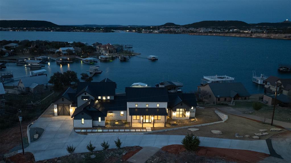 What was started in January, 2024 is now complete! Experience lakeside grandeur in this new Possum Kingdom Lake home ready for your summer lake days. This haven boasts a luxurious main suite, 3 guest bedrooms & a bunk room, each adorned with ensuite bathrooms, ensuring supreme comfort. The gourmet kitchen is a culinary delight while a game room with a bar & wine room promises entertaining evenings. The spacious study provides a quiet place for work or other needs. Unwind and enjoy the outdoor oasis with an inviting pool, hot tub, fireplace, outdoor kitchen & bar, and a large, 2-level boat dock in this protected cove. You'll treasure the afternoon comfort with the sun setting behind you while casting a gorgeous glow on the cliffs across the lake. This exquisite masterpiece offers luxury and convenience against the backdrop of breathtaking lake and cliff views at every turn. The oversized garage (32'L x 15'W x 14'H) caters to your storage needs for boats & toys. Energy efficient and foam-insulated, this home is also pre-wired for AV, security & remote-controlled blinds. It is pre-plumbed for a water softener for spot free shower glass and glassware and is also fiber internet-ready; just waiting for electric company to install in the area. The sprinkler system uses lake water (for a nominal annual fee) making it economical to have a lush green lawn all season long and the front and back retaining walls are engineered to insure soundness and safety. Perfectly designed for full-time living, but certainly a fantastic vacation home or an investment property for short-term rentals. A builder's warranty will be provided upon closing. Note: Picture #12 is virtually staged. Refer to the Floor Plans for an example of furniture placement.