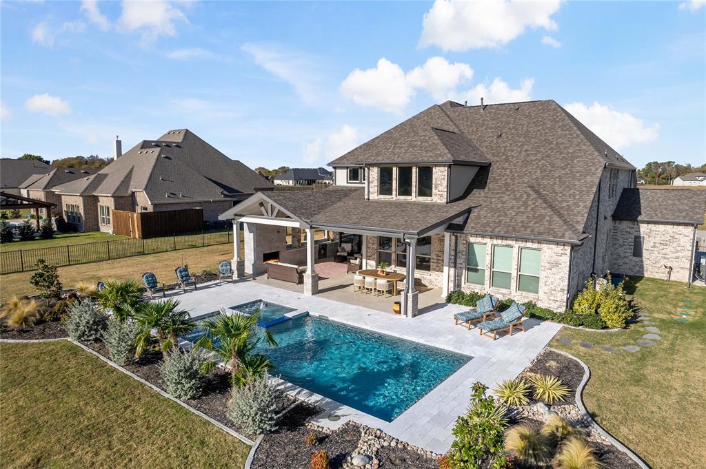 Luxury living awaits in Lakeview Downs, Lucas, near the shores of Lake Lavon, offering the perfect blend of country seclusion with easy access to greater DFW. This stunning two-story home sits on a little over an acre lot and provides a flexible floor plan with a private primary suite, a guest bedroom with ensuite bath, half bathroom, a study, and a flex room on the first level. Upstairs, you’ll find three spacious guest bedrooms, two full baths, and a game-media room. The private primary bedroom is very spacious and overlooks the pool. The spa-like primary bath includes dual vanities, a soaking tub, a walk-in shower, and a closet with direct laundry access. The gourmet kitchen impresses with quartz countertops, abundant cabinetry, a large island with bar seating, a gas cooktop, double ovens, built-in microwave, and a butler’s pantry. The open-concept dining area flows seamlessly into the family room, with rich wood floors throughout most of the first level. Outside, over $250K in recent upgrades have transformed the backyard into a private retreat, featuring a resort-style pool, massive hot tub, outdoor living area, a stunning outdoor fireplace on the patio, built-in griddle, ceiling-mounted heaters, a motorized screen, and a fully sodded and irrigated acre lot with a wrought iron fence. A three-car garage and extra parking provide ample space. Zoned to Princeton ISD with Lovejoy access available via the Scholar’s Program, this exceptional home offers the ultimate in comfort, elegance, and convenience.