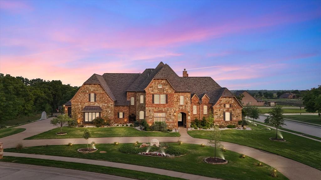 Discover a home where upgrades abound & outdoor living shines. Savor morning coffee by the patio fireplace on crisp winter mornings, entertain guests at the well-equipped outdoor kitchen, or cool off in the stunning lagoon-entry diving pool with waterfall & hot tub. Take a leisurely stroll through the park to the lakes for fishing with family, and don’t miss the breathtaking sunsets! Exquisite Craftsmanship throughout, Spanning 5,513 square feet, this 6-bedroom, 5-bathroom masterpiece offers unmatched versatility, including a private attached apartment with a separate entrance, featuring 2 bedrooms, a living area, full kitchen, bathroom, and exclusive access to the 4th garage space—ideal for a live-in caretaker, mother-in-law suite, or multigenerational living. The chef’s dream kitchen boasts top-of-the-line stainless appliances, including Sub-Zero refrigerator, Dacor 6-burner gas range with dual ovens & pot filler, quartz countertops, two large islands, two sinks, and a built-in wine cellar with butler’s pantry. Elegant finishes elevate the home, with rich hardwood floors, crown moldings, vaulted ceilings, and a striking wrought iron staircase. The spacious primary suite offers direct pool access, a luxurious bathroom with ample vanity space, and walk-in closet with impressive built-ins. Entertain in style in the upstairs theater-style media room, game room with wet bar, and cozy balcony porch. The thoughtfully designed 1st floor includes the primary and guest suites, formal study, dining room, living room, kitchen, mudroom, & 2nd private study off the laundry. Rare features provide peace of mind, including a whole-house reverse osmosis system, emergency generator, and fire sprinkler system—perfect for worry-free living, whether at home or traveling. With easy access to Highways 114 and 287, enjoy quick commutes to Fort Worth and DFW while relishing peaceful, laid-back living without the congestion. Inside and out, this home is designed to impress!