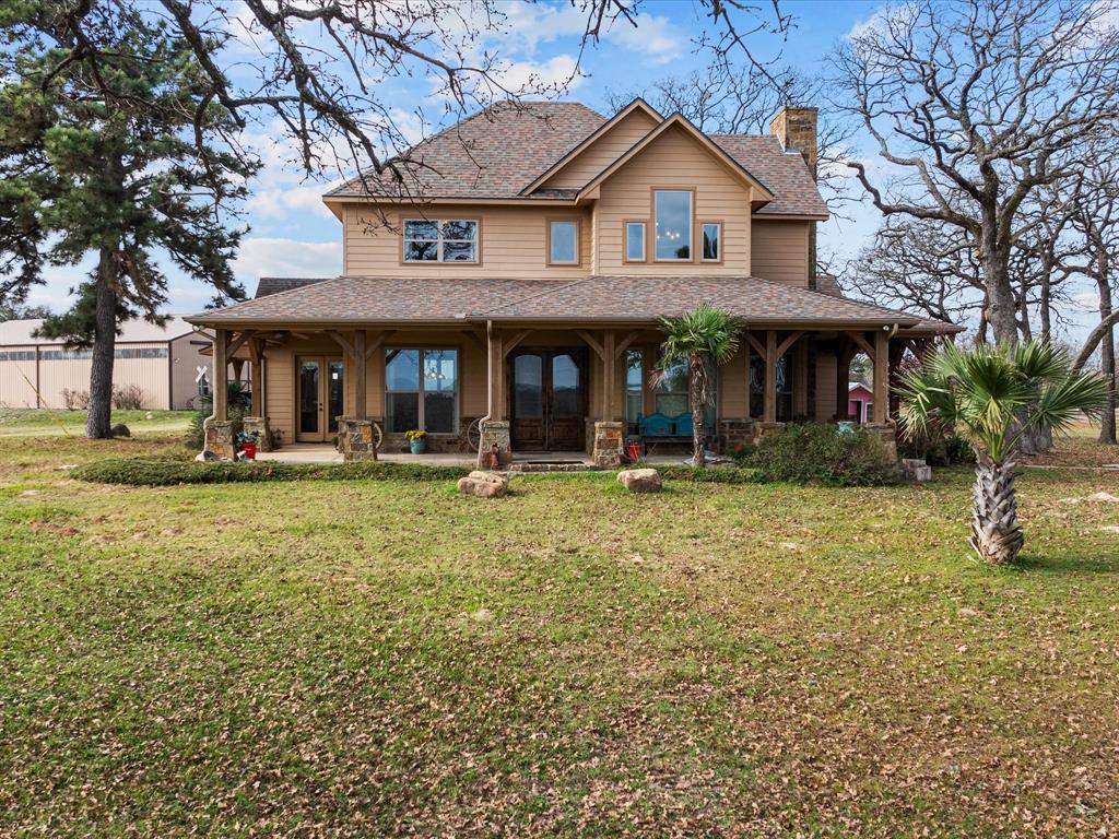 Gorgeous secluded, hilltop property consisting of 40.7 acres and a custom built one and a half story, three bedroom, 2.5 bath home, built in 2014. The home has 2 bedrooms up stairs and the master bedroom downstairs. Tall, vaulted beamed ceilings in the living room with stone fireplace with propane starter, ceiling fans, recessed lighting, ceiling beams are also located in the kitchen, dinning. Wood look tile flooring throughout, except the two upstairs bedrooms, which have carpet. Kitchen has custom cabinetry, walk in pantry, farm sink, large island, bar area, gas stove, electric oven, microwave, along with granite countertops and faux rock backsplash. Master bath has dual walk in closets, granite counter tops, dual vanity, Jacuzzi jetted tub and a tile shower. Jack and Jill Bath upstairs has dual sinks, separate tile shower and granite countertops. Laundry room has cabinets and sink. Exterior is rock wainscot and hardy board siding. Wrap around covered porch. Dual zoned HVAC heating and cooling. Cellulose insulation. 3 car covered carport on concrete slab. Water Well for watering livestock. Crossed fenced. Two ponds and Eclectic gate at entrance. 3600 sq. ft. concrete floored building with electricity, 3 Loafing sheds for horses. Deer are plentiful for hunting. Coop water to house and Coop electric provider. This property would be excellent for horses or cattle.