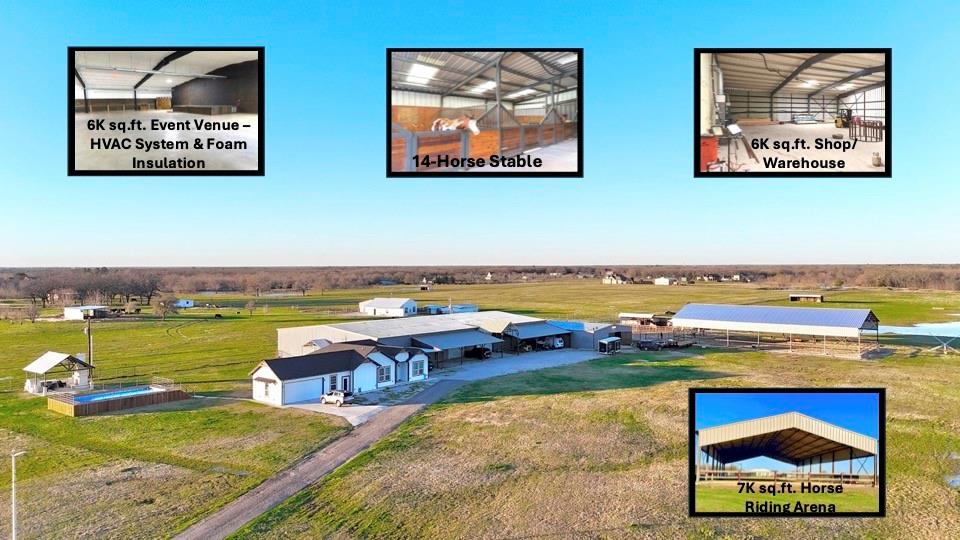 $$$ 10,000 BUYER ASSISTANCE TOWARDS LOWERING MONTHLY PAYMENT OR CLOSING COSTS IF YOU CLOSE BY JULY 31ST!! PRICED TO SELL!! GORGEOUS 33-ACRE RANCH INCLUDES A 7200 SQFT HORSE RIDING ARENA! 2,150 SQFT MODERN FARMHOUSE FROM 2023* WITH LOTS OF UPGRADES, 6,000 SQFT EVENT VENUE WITH CAPACITY FOR 300 GUESTS, 6,000 SQFT WAREHOUSE WORKSHOP, 150X20 COVERED PORCH, AND 14-HORSE STABLE. OUTDOOR KITCHEN AND ABOVE-GROUND POOL WITH 16'X32' DECK. COZY MODERN FARMHOUSE WITH OPEN CONCEPT FEATURING 3 BEDROOMS, 2 BATHROOMS, 1 OFFICE, AND 2-CAR GARAGE. GRAND KITCHEN WITH GORGEOUS CUSTOM CABINETS REACHING THE CEILING, HUGE ISLAND, AND BEAUTIFUL QUARTZ COUNTERTOPS. LOVELY MASTER BEDROOM WITH STAND-UP SHOWER AND FREE-STANDING TUB. ELEGANT TILE FLOORS THROUGHOUT THE HOUSE. HIGH CEILINGS AND RECESSED LIGHTING THROUGHOUT. MAKE THIS GORGEOUS RANCH YOURS! ALL INFORMATION DEEMED RELIABLE. BUYER(S) & BUYER'S AGENT TO VERIFY ALL INFORMATION.