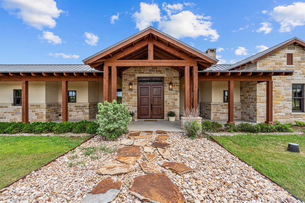 Discover luxury living in this Dan Thomas Custom Home, designed by Duke Garwood. Situated on a serene 12.5-acre lot in a gated community, this ranch-style home blends elegance with nature, just 20 minutes from Downtown FW. The open floor plan is perfect for entertaining, featuring a circular driveway. The master suite, separated from guest bdrms, offers privacy. Trestlewood reclaimed timbers adorn the ceilings of the master bdrm, office, & great room, which features a large handcrafted stone fireplace. The kitchen boasts custom island with downdraft stove. Enjoy Reclaimed Designworks walnut flooring & Tumbled Silver Travertine in the great room. Home has Kolbe French doors & windows, plus expansive cedar-covered porches for relaxation & entertaining. Additional features include a dog trot hall with a laundry room, custom cement storm shelter, & numerous custom details. The property also includes a 1,728 sq. ft. Morton Building barn with 4 stalls, a tack room, feed room, & 2 wash racks.