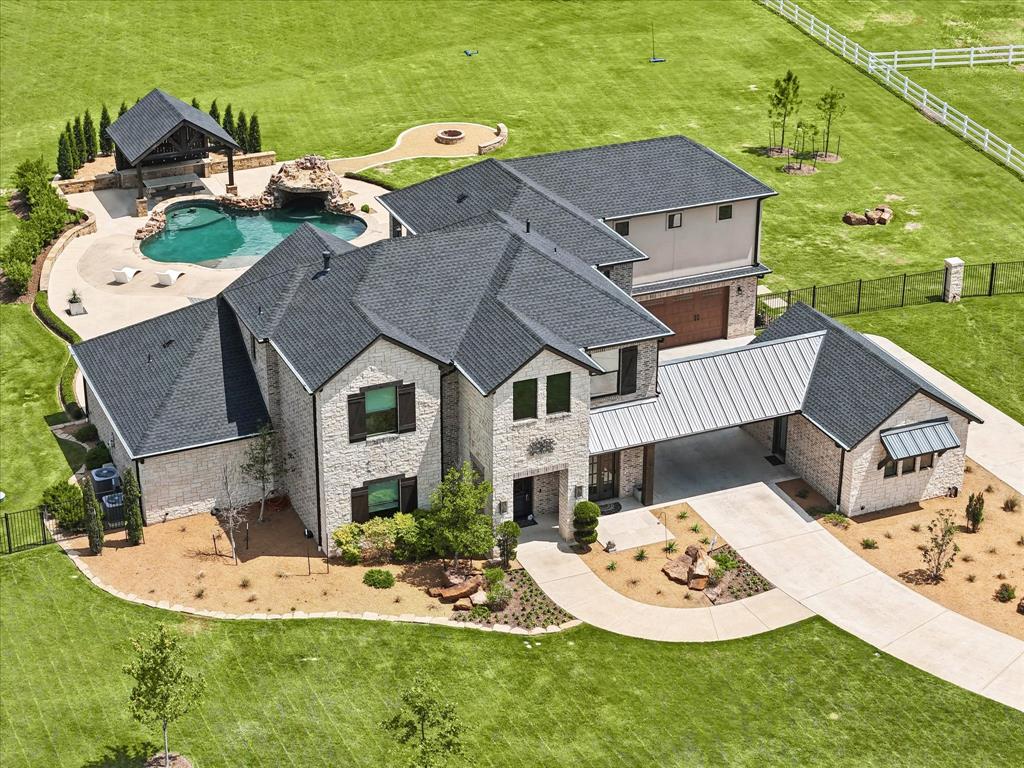 Welcome to an entertainer's paradise! This stunning, model-like home is in the highly sought-after equestrian community of Saddlebrook Estates. Situated on 4.055 acres, this horse property allows for up to two horses to be kept on-site. The property features a private stocked pond with extensive landscaping. The spacious gourmet kitchen, equipped with top-of-the-line amenities, opens to the family room, vaulted ceiling, wood beams and stacked blackstone fireplace. Updated media room on the first floor is perfect for entertaining, featuring a wet bar with Amber Onyx and LED lighting, plus a fridge. Adjacent to the media room, you'll find a custom-built wine room. The home includes a downstairs study and a secondary bedroom with a private bath. The primary bedroom offers a large sitting area, a balcony overlooking the backyard oasis, and a spacious closet with a hidden bonus room. Additional bonus room located between 3rd & 4th bedrooms. Outside, enjoy the resort-style pool, fire pit, and two outdoor entertainment spaces complete with a built-in grill. Equestrian enthusiasts will love the convenience of nearby horse boarding and training facilities, as well as the extensive network of equestrian trails. The property is situated in the sought-after Argyle ISD school district. Your dream home is ready and waiting for you!