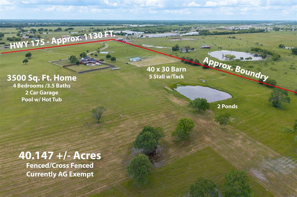 If you’ve been dreaming of a home where the stars shine brighter, the land stretches wide, and peace comes standard—this 40± acre retreat on Hwy 175 might be exactly what you’ve been searching for. Tucked behind approx. 1130 feet of highway frontage, this scenic property features large, open pastures dotted with beautiful mature trees, two peaceful ponds, and everything you need for horses or animals, including a 30x40 barn with five stalls, a tack room, and water and electric in place. The land is fenced and cross-fenced, currently AG exempt, and perfectly set up for those wanting to live close to nature without sacrificing convenience—just 45 minutes from the heart of Dallas. The home is spacious and full of charm, with thoughtful touches throughout. A cozy wood-burning fireplace anchors the living area, while custom built-ins add style and storage in all the right places. You'll find not one but two primary bedrooms—one upstairs, one down—perfect for multi-generational living or guest comfort. The downstairs suite is a standout, with a spa-like bathroom, oversized walk-in shower, and generous closet space. The kitchen is a true gathering place, equipped with double ovens, a center island, and plenty of cabinetry. A formal dining area, dedicated office or flex space, oversized mudroom, dry bar with wine fridge, and attached two-car garage round out the interior highlights. Step outside and unwind in your private backyard oasis, complete with an in-ground pool and hot tub overlooking the wide-open Texas sky. With room to roam, the infrastructure already in place, and potential for future expansion or alternate uses, this property is more than a home—it’s a lifestyle. Whether you envision horses in the pasture, cattle by the fence line, or simply soaking up the stillness of country life, this East Texas gem is ready to welcome you home. Owner is willing to consider owner financing with the right terms.