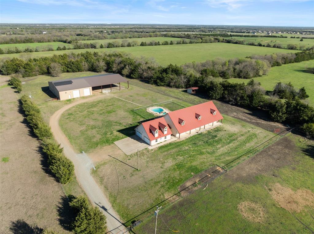 Price Improvement! This unique North Texas property is the epitome of country ranch living - live here, ranch here, expand your business. The existing amenities are incredible! From the gated entry, a long winding drive gives you a peek into the gorgeous 18+ acres, including the spring fed pond. With over 5000 sq ft of total living space, the property was designed to enjoy the ranching lifestyle with style & comfort, including entire home solar panel system. Open concept living, kitchen & dining, hosting here is a breeze! Living area is anchored with an inviting fireplace, flexible space allows you to create one large living space or cozy conversation areas. Expansive kitchen, beautiful cabinetry, generous counter space, walk in pantry & breakfast counter, this is the place to gather! Custom lighting fixtures define the casual dining area. All four bedrooms are located on main floor. Primary bedroom is spacious, large ensuite, fireplace, gun safe & walk in closet. Upstairs is reserved for the gorgeous Media Room & massive Game Room, all generations will appreciate this fun space. Above the 2 car garage is a flex space, currently used as a gym. Huge covered patio brings the party outside, with full views of relaxing pool with a bridge style water feature. The shop is ready for business! Massive 60 x 90 enclosed area features 16 ft walls, soaring ceilings, five 14 ft roll up doors, car lift and basketball goal. Living quarters with kitchen & full bath add to the options here. Under the same roof is a 80 x 90 covered area, plus full RV hookup. This impressive metal building presents endless possibilities. Consider as a party barn event center or adapt as an arena. The land is fenced and cross fenced, with loafing shed and pig barn with stalls. Outstanding location, 10 minutes to shopping, restaurants, HEB Melissa, appr. 30 minutes to McKinney & Sherman, 1 Hr to DFW Airport. This property must be toured to fully appreciate everything the property provides & lifestyle.