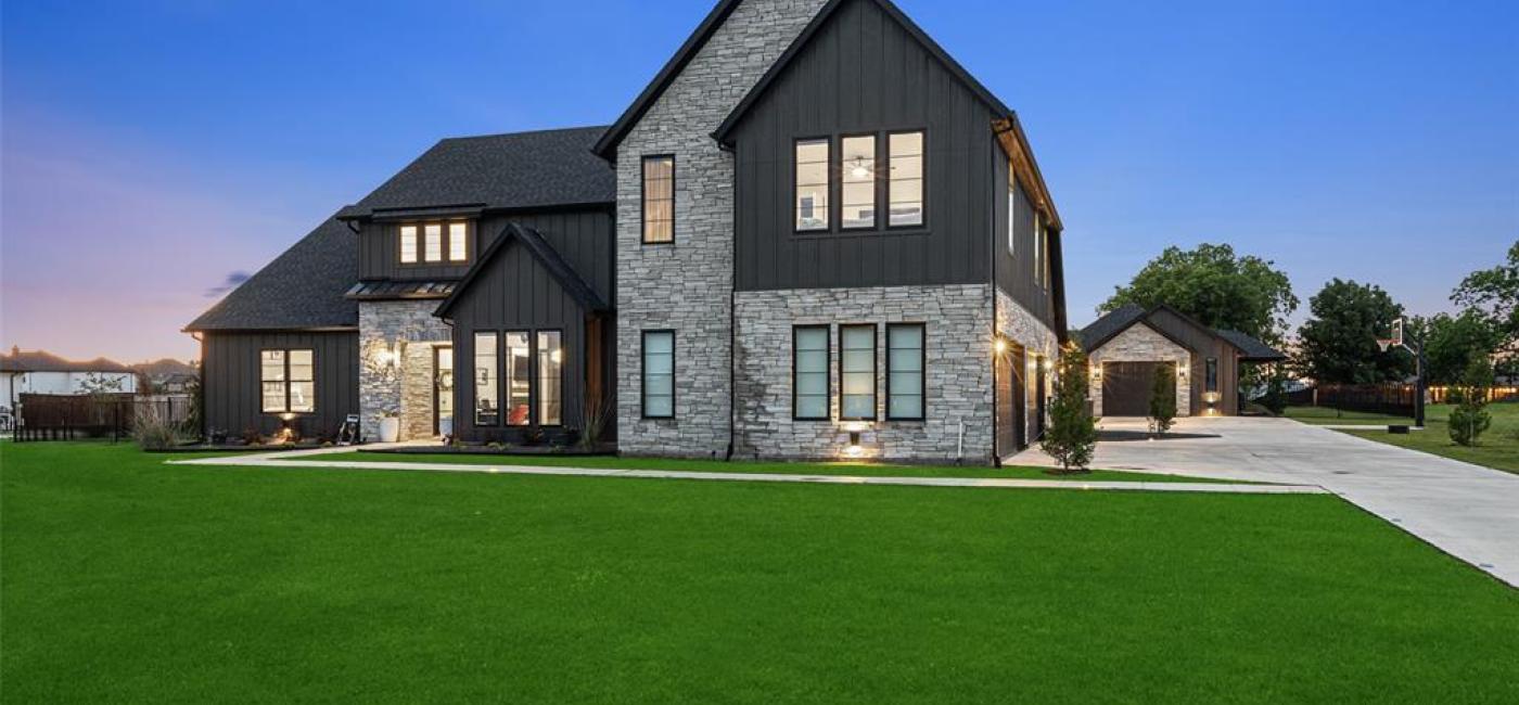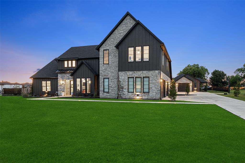 Custom built & situated on an acre, this designer home has over 5000 square feet with a detached secondary residence. The secondary home is perfect for family or used for additional income. Designed to perfection with a thoughtful floor plan, every room is destined to be your favorite. Drive up to find a beautiful stone exterior, custom landscaping, black trim windows & modern double glass front doors. Enter the home & see the most perfect view of the backyard patio, fireplace & custom pool. The wall length sliders allow for the outside to join with the indoors. The great room with built in shelving, custom lighting & vaulted ceilings is the heart of the home. The dreamy kitchen has ceiling height cabinets, a commercial gas range & oven, pot filler, quartz countertops, & cabinet hardware. The pantry with glass door & custom cabinets and shelving create a tidy place to store food & appliances. The master bedroom is privately located near the back of the home with a cozy fireplace & a luxury en-suite bathroom. The stand alone tub, floating cabinets, oversized frameless shower & designer lighting creates a tranquil spa like space. The secondary bedrooms are in the opposite wing with bathrooms attached & custom built bunk beds. Upstairs has a spacious game room & media large enough to entertain. The property has a secondary home perfect for extended family, or visits. The back home has 2 bedrooms, a bathroom with a walk in shower, a spacious living area that is open to the kitchen, a washroom & connected office nook. A garage is attached for private parking. The lot has been completed irrigated & fenced. The back patio is open with a fireplace & endless views of the open north sky. Custom walls treatments & window coverings have been added. Located near 121, 75 & the newest TI headquarters, this acreage home zones to the incredible Van Alsytne ISD with a total of 5 garage spaces.