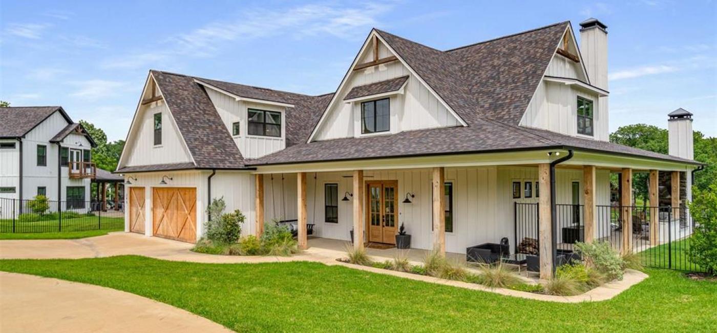 Just one hour from Dallas, 205 Oak Creek Drive isn’t just a lake house—it’s a destination. Perched above the shoreline in the heart of Cedar Creek Lake, this custom modern farmhouse delivers sweeping water views, refined indoor-outdoor living, and spacious design ideal for gathering friends and family year-round. Inside, the open-concept layout centers around a vaulted great room with warm wood beams, shiplap walls, and a stone fireplace. Expansive windows and French doors flood the space with natural light and stunning lake views. The designer kitchen boasts quartz countertops, a large island, and premium finishes—perfect for morning coffee, holiday spreads, or casual dinners for twelve. The flexible layout includes a main-floor study (or guest suite) with a full bath, plus a secluded primary suite with private patio access to enjoy sunrise on the water. Upstairs, two guest bedrooms with en-suite baths provide comfort and privacy, while the massive rec wing includes a bunk nook, full bath, game room, and private bedroom—ideal for kids, teens, or extended guests. Outside, a wraparound covered porch with porch swings, an outdoor fireplace, and built-in grill offers the ultimate entertaining space—perfect for hosting Thanksgiving by the fire or watching football with a lake breeze. The fenced yard leads to a private boathouse with a 25-ft boat slip, two jet ski lifts, and a party deck with open water views. Located in the friendly Arnold Hills community, 205 Oak Creek is perfect as a full-time home, holiday hub, or weekend retreat—just a short drive from the city, but a world away in experience.