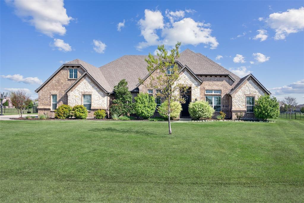 Welcome to this stunning one-story home nestled on an acre in the highly sought-after DC Ranch subdivision in Celina. Designed with comfort, elegance, and entertaining in mind, this custom home offers the perfect blend of upscale living and thoughtful design. Step inside to discover soaring high ceilings, engineered hardwood floors throughout the main living areas, elegant crown molding, & beautiful architectural details like archways, coffered ceilings in the formal dining room, & trey ceilings throughout most rooms. The open floorplan is both functional & inviting, perfect for daily living & entertaining. The spacious living room features a striking stone fireplace with gas logs & a wall of oversized windows that offer sweeping views of the backyard. The living room flows seamlessly into the gourmet kitchen, which boasts a massive granite island with bar seating, gas cooktop, double ovens, large walk-in pantry, & abundant counter space. A flexible bonus room adds even more versatility—ideal for a media room, playroom, home gym, or additional living space tailored to your needs. The private primary suite is a peaceful retreat, complete with a cozy seating area, spa-like ensuite bath with a soaking tub, oversized walk-in shower, dual vanities, and an impressively large walk-in closet. Secondary bedrooms are located on the opposite side of the home for added privacy. A dedicated office makes working from home comfortable & efficient. The spacious laundry room includes built-ins, a folding counter, hanging area, sink, & space for a full-size refrigerator. Step outside to your very own backyard escape, featuring a sparkling pool with tanning ledge & attached hot tub, an open-air pavilion perfect for entertaining, & a covered patio with its own fireplace for cozy evenings outdoors. Enjoy peaceful country living with all the modern luxuries—this home provides the perfect balance of space, style, & tranquility in one of Celina’s most desirable communities.