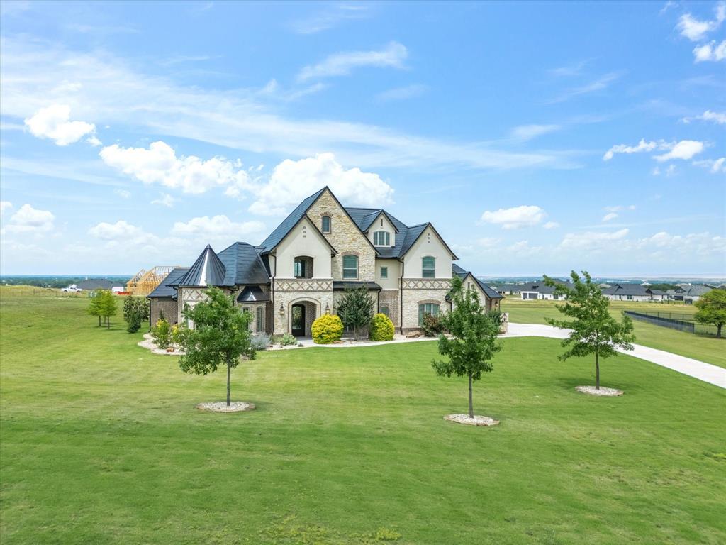 Extraordinary European Country inspired home in one of the most desirable additions in Aledo -- La Madera Estates! Superbly built with perfect blend of sophisticated yet livable style and appointed from head-to-toe with gorgeous finishes and state-of-the-art amenities including TESLA Powerwall Backup Power Grid plus Class 4 rated TESLA Solar Roof Tiles — ultra energy efficient and arguably the most impressive feature of the home! Bright and open design chef's kitchen with SS commercial grade appliances, 6 burner cooktop and double ovens. The kitchen opens to impressive great room with high ceilings, impressive floor to ceiling stone fireplace, gleaming hardwood floors and great windows overlooking it's incredible resort-like backyard! Fabulous outdoor pool cabana with built-in BBQ grill and outdoor kitchen and living space overlooking a stunningly sleek pool with Pentair LED color lighting, pristine landscaping and gorgeous views of serene lake and pretty estate properties all around! Acclaimed Aledo ISD.