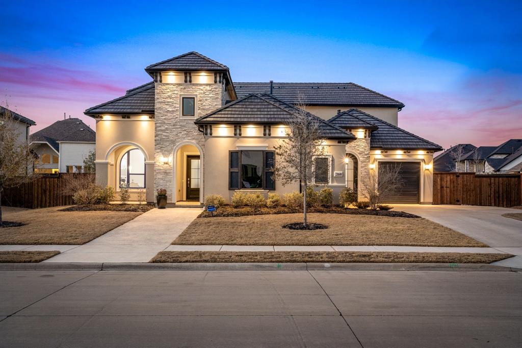 Where elegance meets modern luxury, this stunning 5 bedroom, 5.5 bath, 3 car garage home is located on a .31 acre lot in the coveted Star Trail in Prosper. This Toll Brothers 'Valen' model was one of the most popular & award-winning! Upon entering, you are greeted by beautiful white oak floors and an abundance of natural light that enters through the private courtyard; enjoy your evenings next to the outdoor fireplace. The seamless floorplan flows throughout with custom designer touches at every turn. The upgrades do not disappoint, featuring designer light fixtures, Sub-Zero refrigerator & freezer, custom cabinets & built-ins, custom California closet, upgraded SS Wolf range & microwave, custom vent hood, upgraded wine room, and much more! The first floor features a study, half bath, bedroom with an ensuite bath, primary bedroom with ensuite bath, kitchen, dining, utility room, mud room, and living space. The kitchen is Chef's dream, with an oversized island with waterfall quartz, upgraded Kohler Neoroc sink, massive butler's pantry, and sub-zero & wolf appliances overlooking the dining & living room featuring wood beams, upgraded linear fireplace, and a wall-to-wall glass sliding door & two full walls of windows! The oversized primary bedroom is a retreat of its own equipped with a large garden tub, his and hers vanities, double entry oversized shower, and his and her closets. The second story features a second oversized living space, media room, 3 bedrooms, and 3 bathrooms, 2 of these bedrooms feature an ensuite bathroom. All bathrooms have upgraded mirrors and lighting. The community of Star Trail includes exclusive amenities such as a clubhouse, outdoor lounge area with fireplaces, 3 resident-exclusive swimming pools, tennis courts, and parks, and is just one mile to Dallas Tollway with dining, shopping, and entertainment close by. Experience luxury living at its finest at 2160 White Oak Way, where every detail has been thoughtfully curated.