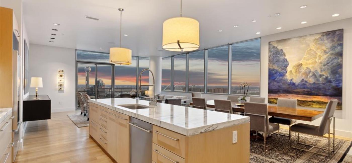 Perched on the 17th floor of The House Condos, a striking Philippe Starck-designed high-rise in Victory Park, this sophisticated residence offers breathtaking floor-to-ceiling views of the Santiago Calatrava-designed Margaret Hunt Hill Bridge and the dazzling Downtown Dallas skyline. The impeccably designed kitchen showcases statuary marble, a custom pantry, and top-tier appliances, including a Sub-Zero refrigerator, Wolf oven, Bosch induction cooktop, and Asko dishwasher. The primary suite is a serene retreat featuring a statuary marble-clad bath with double vanities, an oversized soaking tub, a separate shower, and a custom closet system. Elegance abounds with light white oak flooring throughout, motorized shades, Lutron lighting, and museum-finish walls. A separate utility room enhances convenience, while the second living area offers versatility as a den or study. Two private balconies, including one off the primary suite, provide stunning outdoor spaces. The residence also includes two dedicated parking spaces and a storage unit. Indulge in world-class amenities, including a pool terrace with a 130-foot saline infinity pool, a separate spa, a stylish lounge, a guest suite, and a state-of-the-art gym. Exceptional services such as concierge, valet, 24-hour security, and package delivery ensure a seamless living experience.