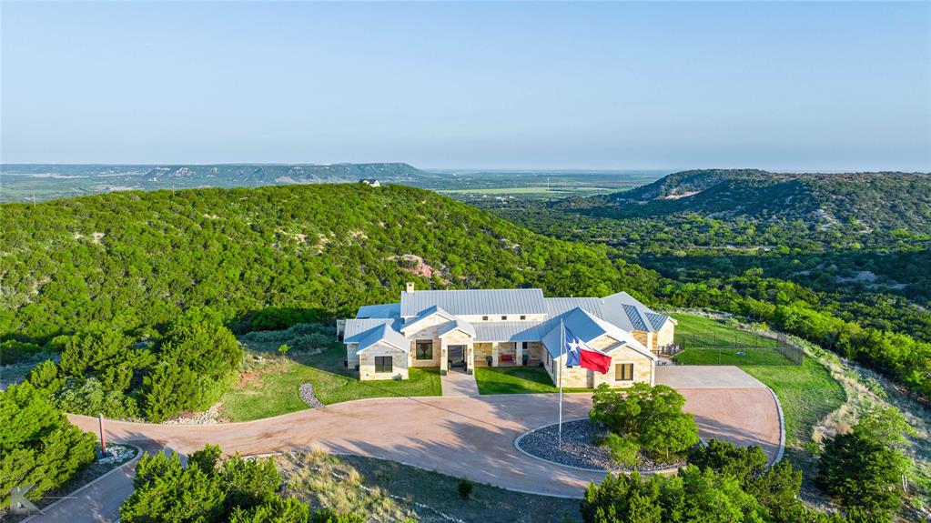 This one-of-a-kind, 3-bedroom, 4-bath home atop Steamboat Mountain outside Buffalo Gap provides unequalled views & interior finishes on this secluded 21.31-acre lot. Situated to showcase the surrounding terrain, oversized plate glass windows and doors flood the home with natural light while framing the stunning vistas and nature’s light show each evening from sunsets over the pool to the west. The primary axis of the home is the 48’ x 22’ open-concept great room, with a substantial limestone block fireplace and living area opposite the kitchen flanking space for a long dining table. The kitchen has wood beam accents, a massive island with built-in shelving, dual sinks, & stone countertops. High-end stainless appliances, custom cabinetry, a farmhouse sink, & pendant lighting combine functionality with style. Large windows along the west side of the house are shaded by a porch that runs the length of the structure, providing shaded natural light & views that remind the owner: this home cannot be replicated. The 4,908 square foot interior has three HVAC systems (one for the garage with two kennels to keep pets in comparable comfort). The two secondary bedrooms occupy their own suite & each have ensuite baths. The primary suite has windows that provide expansive views to the north & west, ensuite bath with dual vanities, tub & separate shower with stone finishes. The massive closet hides a built-in safe room for peace of mind. The pool & patio is oriented west, allowing one to enjoy the views to the valley. A shaded backyard cabana provides additional space to enjoy the outdoors & the views. The standing seam metal roof adds modern durability. The detached 1220 square foot shop is equipped with a commercial HVAC unit & provides ample room for storage, projects, or shelter for up to 4 additional vehicles. The workshop has seller-owned solar panels that provide power to the house & shop for reduced utility bills. More photos at rabbitrun.barnetthill.com.