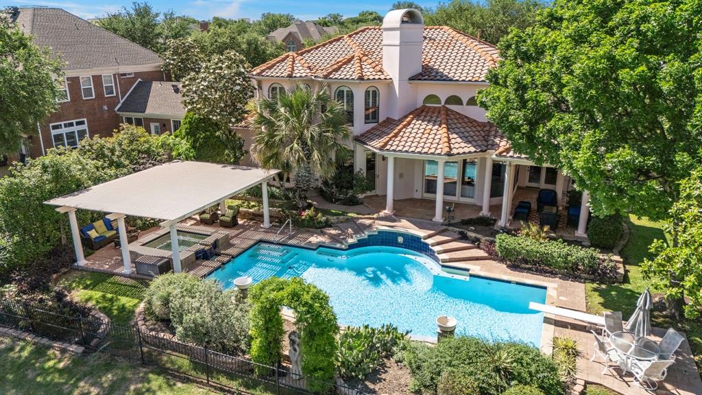 Welcome to this stunning Mediterranean-inspired retreat located in the prestigious Hackberry Creek gated community with 24.7 security guard service. Enjoy unobstructed views of the 18th fairway and tranquil water features from your own private oasis.This elegant home features Venetian plaster walls, a stucco exterior, Saltillo tile floors, and plantation shutters throughout. New custom drapes and shades add a fresh, luxurious touch to the sitting room. The chef’s kitchen is a culinary dream, boasting commercial-grade appliances and enhanced with new built-in shelving in the kitchen for seamless organization. Step outside to your own backyard paradise, complete with a sparkling pool, relaxing jacuzzi, and a lush, professionally landscaped garden—perfect for entertaining or unwinding after a long day. Recent upgrades include new foam attic insulation, 2019 roof replacement, new gutter guards, a modern sprinkler system, and a new water filtration system. A spacious three-car garage adds convenience and practicality. This home offers the perfect balance of comfort, luxury, and lifestyle in one of Las Colinas most desirable gated communities.