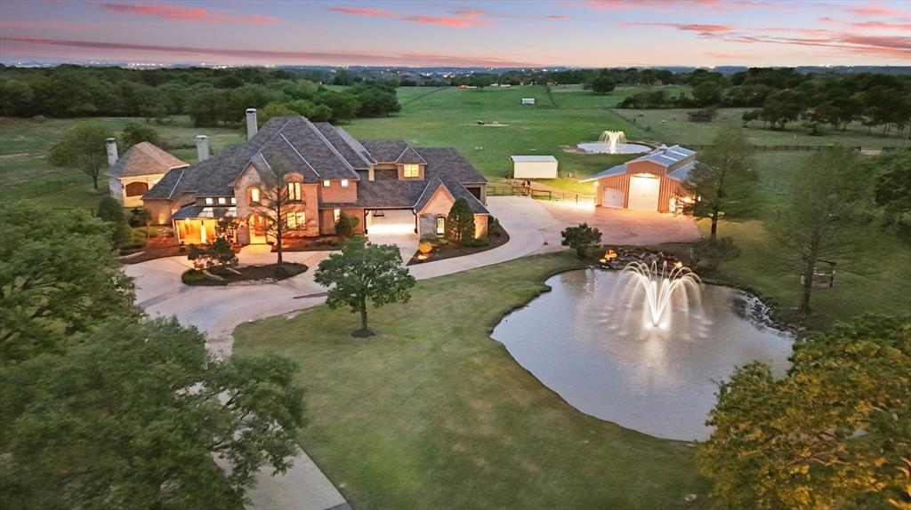Peaceful Perfection! Welcoming Luxury Estate in the center of Flower Mound LOADED WITH UPDATES! A rare opportunity to own this move in ready estate on 8.35 acres! Wind peacefully on Scenic Drive and enter through the electric gate into this desirable New Haven custom built home. Gorgeous entry with soaring ceiling & designer entry lighting welcomes you home. Large office with gorgeous front views and French doors. Comfortable, livable floor plan offers new carpet, updated colors throughout, hand scraped wood floors, recently updated open chef's kitchen w.Fisher&Paykel gas range, built in refrigerator, large island & timeless brick arches accenting the oversized family room with gorgeous wood beams & beautiful backyard views. Exquisite wine cellar&butlers pantry convenient to kitchen & dining room! Luxury Primary suite on main level offers designer touches in the recently updated large ensuite, two large walk in closets, dual vanities, bath, steam shower, & see through fireplace. Ideal multigenerational home with a 2nd bedroom & full updated bathroom on main level with own private hallway. Upstairs offers 3 bedrooms, 2 bathrooms, large media room living space and game room with outdoor patio balcony overlooking pool. Upstairs 5th bedroom, or flex room, is currently used as home gym.Resort style backyard includes large pool & spa with lazy river & outdoor speaker system.Pool replastered w.pebbletec last year. 900 SF Cabana offers full outdoor kitchen, large living area with 70 inchTV & heaters.Custom metal barn w. finished floor, RV hookups, 14 foot high door, drive thru doors, wash drains & more! Fence surrounds 7 acre pasture. Private 875' deep water well to fill ponds & use for sprinkler system! 2 Pond tanks in back pasture & front with fountain. 6 car garage featuring porte cochere. Close to Lake Grapevine & hiking, biking trails. Minutes from exemplary schools. Horses & donkeys available to convey with property. Ag exemption currently in place. New HVAC units.