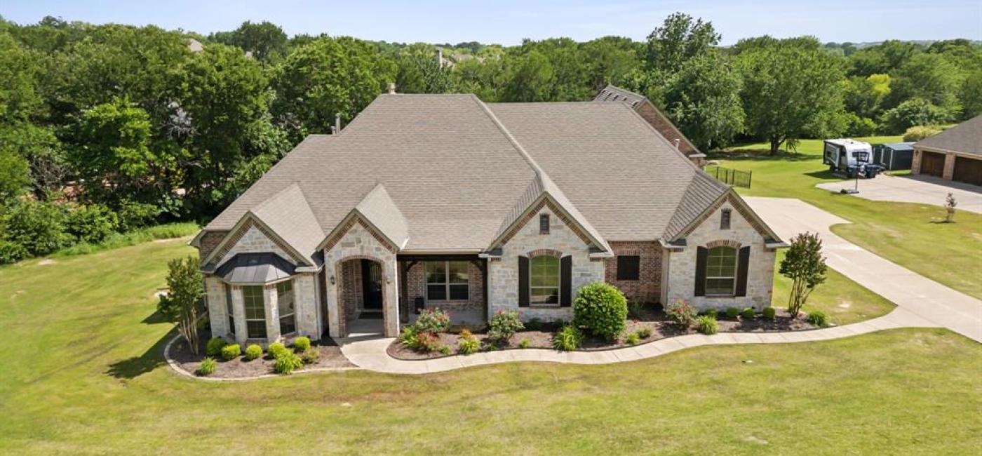 OPEN OCT 19th FROM 2-4 COME TOUR AND GET A FREE GIFT CARDS TO YOUR FAVORITE COFFEE SHOP. Escape the hustle of the metroplex to live in this custom-built 4000 Sq Ft home situated on a sprawling 1-acre lot surrounded by mature trees. Designed for both comfort and lifestyle, this residence offers a great place to live, play and work. 5G Fiber internet is a bonus! This beautiful house stands out as the timeless front exterior showcases a gorgeous blend of brick, stone, and cedar finishes, and beautiful landscaping. Inside the home, this thoughtful floor plan includes four bedrooms downstairs, along with a guest suite upstairs with a full bath. The flexible floor plans has 2 offices or craft room with built-ins. The Primary Suite is 23 x 15. The floor-to-ceiling windows have a view of the pool and trees in the backyard. The ensuite bath has double vanities and dual closets with built-in dressers. The living, dining, kitchen, and work areas downstairs have hand-scraped hardwood flooring. All of the carpet in the house was replaced in May of 2025. The spacious kitchen, with 2 sinks, lots of storage, and counter space, is a great place to cook and entertain. The kitchen has a gas cook-top, a large breakfast bar, beautiful custom cabinetry and hood. The walk-in pantry has room for everything! The backyard has features for all seasons. The pool and spa, built by the renowned Allison Pools, is picturesque with a backdrop of mature trees. In the Wintertime, you will enjoy cozying up to the built-in fireplace on the back patio. Your dogs and kids will enjoy the separate fenced-in play yard. This property is more than just a house—it's a private retreat in the country where you can enjoy luxury, space, and serenity every day We are looking for a new family to fill this home with love, laughter, and fun. If you are ready to make beautiful memories and you want to be in the very sought-after, after award-winning VAISD, come tour this beauty.