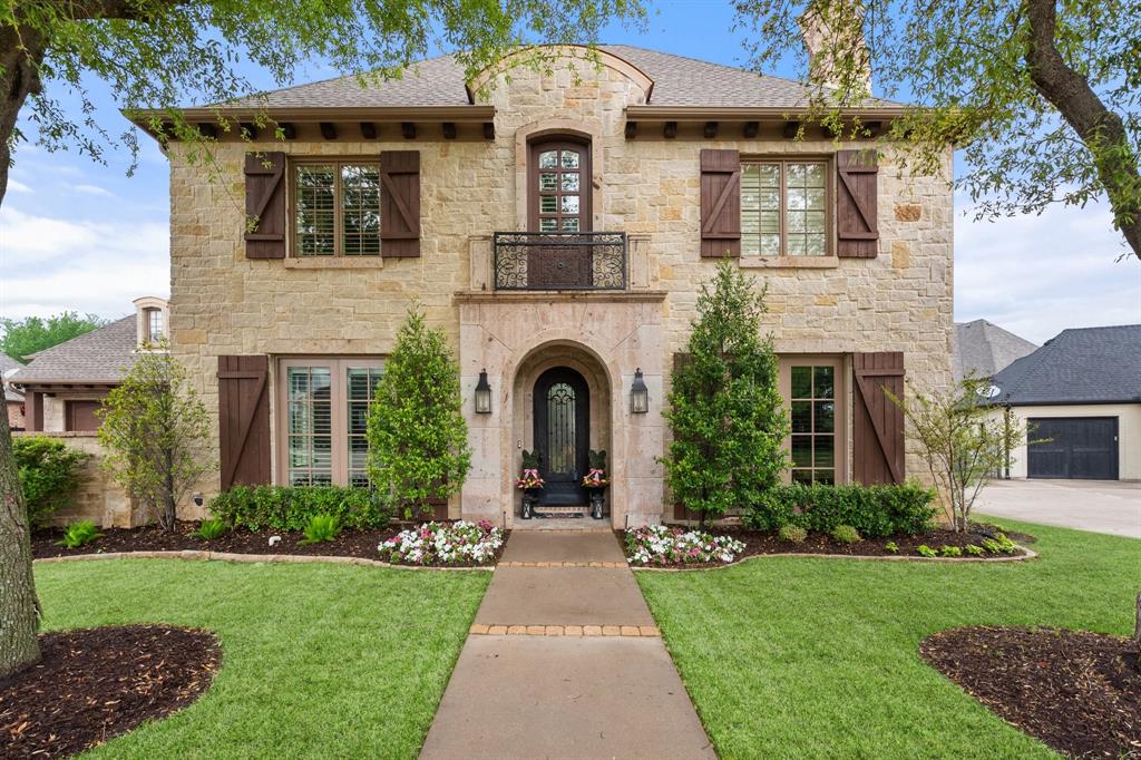 OPEN HOUSE SAT, SEPT 20th. 10-1 This exceptional luxury residence is now BETTER THAN EVER with a new, improved price! Opportunities like this one are rare. Beautifully designed and thoughtfully updated, this spectacular French Style home is located in highly desirable and exclusive Strawberry Fields. This home boasts custom details throughout including coffered ceilings, hardwood floors, designer lighting and fixtures, 3 fireplaces, wood beams in the kitchen and more. With 4 large bedrooms, 5 baths, study and media flex room, the generous floor plan offers multiple areas for entertaining and family living. Perfect for a growing family or executives. Primary bedroom downstairs with wood floors, large ensuite bath with dual vanities and garden tub. Second master bedroom upstairs with ensuite bath and walk in closet. 2 additional bedrooms upstairs with a large jack and jill bath, each with a private vanity and walk in closets. The recently updated kitchen includes Taj Mahal quartzite counters, dual sinks, abundant storage, custom cabinets and an oversized island with extra seating. The spacious primary living room includes a stunning gas fireplace and wall of windows overlooking the covered back patio, outdoor fireplace, HEATED SPA AND SPARKLING POOL. Private office with french doors, stunning cast stone fireplace, built in cabinets and sitting area. The large media room includes a kitchenette, bathroom and media equipment. Perfectly situated between Dallas and Fort Worth with access to highly rated MISD schools, NEW HEB, hospital district, shops, restaurants, HWY 360 and 287. 2023 KITCHEN REMODEL, 2022 NEW ROOF, 2022 NEW CUSTOM FRONT WINDOWS.