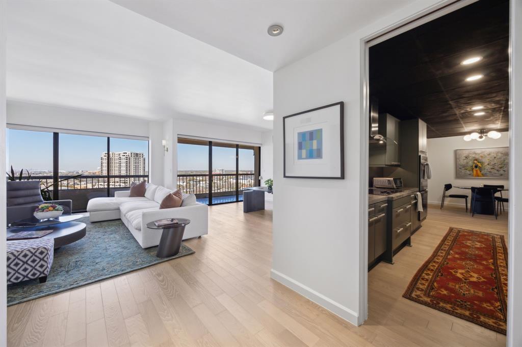 Move-in ready remodeled two bedroom, two and a half bath unit with expansive windows and a huge terrace that offer beautiful sunset views. New LVP hardwood type flooring, updated lighting, and remodeled guest bathroom. Kitchen features concrete countertops, stainless steel backsplash, modern kitchen with painted green cabinets and updated pulls. Cozy study off of kitchen and living room makes for a perfect home office or place to read and enjoy your open city views. The terrace runs along the entire unit with access from study, living room and both bedrooms! Spacious primary suite has a sitting area and ensuite bath with dual closets. There is a large bonus storage closet off of the primary that can store luggage, bikes or workout equipment. Monthly HOA dues include all utilities except electricity, internet, and cable. Owners enjoy The Warrington's superior resident services. Amenities include: a year-round heated pool, hot tub, outdoor kitchen, tennis-pickleball court, fitness center, dual-zone dog park, owner's entertaining area, valet parking, and concierge.