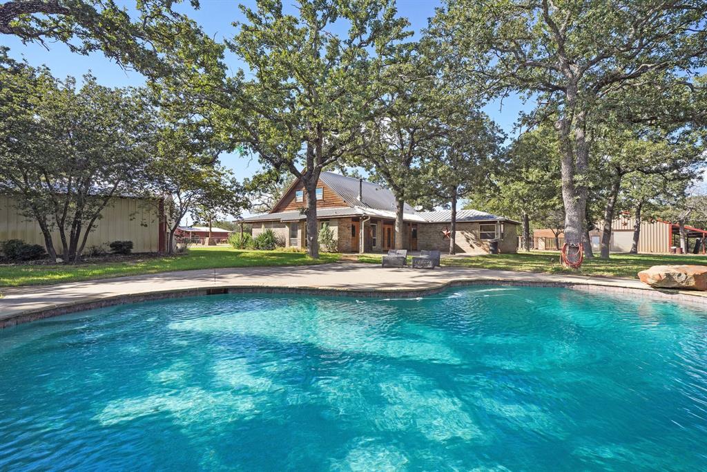 The property of your dreams awaits you! This 29+ acre ranch just north of historic Downtown Mineral Wells boasts a beautiful custom home with updates, custom pool and outdoor kitchen, views for miles, a nice 4 stall horse barn, two shops, two RV carport and more! If you enjoy nature, entertaining, or anything horse or livestock related, this property is for you! The property is complete with lots of mature oak trees, multiple pastures, pipe fence, a pond for fishing or watering livestock and hilltop views to the east and west. This perfectly styled hilltop ranch home features a beautifully updated kitchen, bathrooms, custom features throughout, a new $30,000 whole house Generac generator, a water well and more! Boasting 3 large bedrooms and 3 baths, the home features beautiful accents throughout the home.