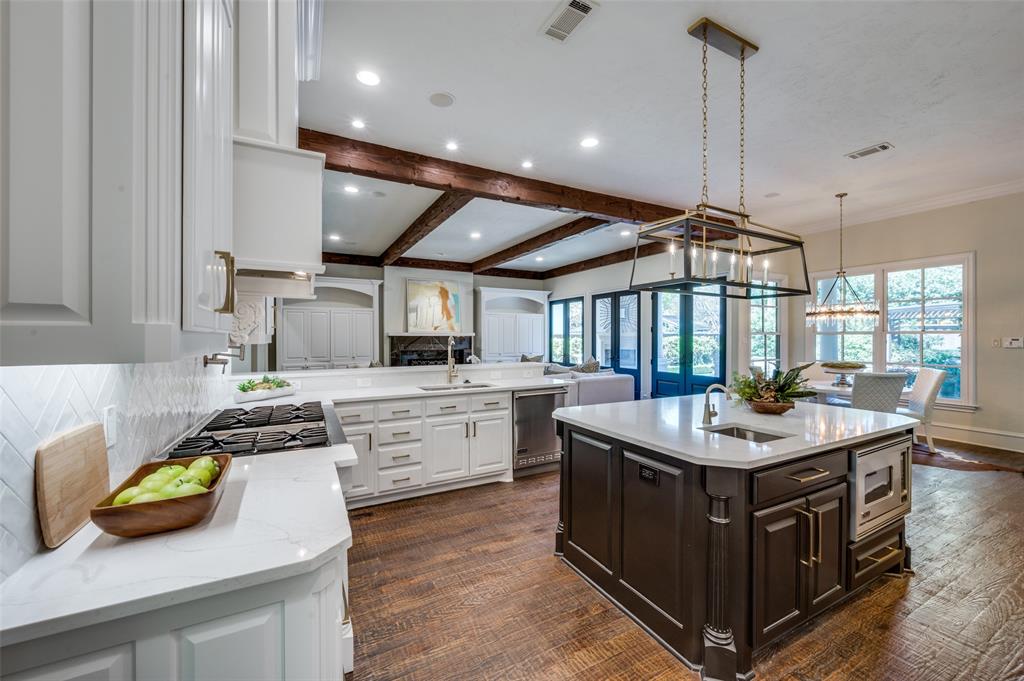 This stunning, updated University Park home, ideally situated in The Fairway, has just undergone a significant price reduction, offering a rare opportunity to own a luxurious residence at outstanding value. Spanning 6,051 square feet on a generous 71x160 lot, this home combines timeless sophistication with modern functionality. Designed for both entertaining and everyday living, the home boasts soaring ceilings and a beautifully updated open floorplan that promotes effortless flow between expansive living, dining, and outdoor spaces. The result is a light-filled, welcoming environment ideal for both gatherings and daily comfort. Key Features: Updated gourmet kitchen with Viking appliances, overlooking a cozy family room with exposed wood beams and fireplace and backyard patio and pool. Elegant, remodeled wood-paneled office with French doors—ideal for working from home in style Three-car stacked garage offering ample space and storage Resort-style outdoor living with fireplace, pool & spa, built-in cooking station, and a pergola-shaded sitting area The main floor includes an isolated ensuite guest bedroom, formal dining room, and a sun-drenched living room with peaceful greenbelt views. Upstairs, the expansive primary suite offers a private balcony, a beautifully renovated spa-like bath, an oversized closet, and a personal beverage cooler. Three additional ensuite bedrooms, a spacious game room or living area, and a large home theater with beverage refrigerator complete the second level. The third floor provides a versatile bonus room—perfect for a game room, lounge, or private retreat—with ample storage throughout. Cat-5 wiring ensures modern connectivity, and the location is unbeatable—just a short walk to restaurants, shops, parks, churches, and grocery store. This home is a true standout in layout, design, and value. Don't miss an extraordinary opportunity to buy in one of University Park's most desirable neighborhoods—now at a newly reduced price.