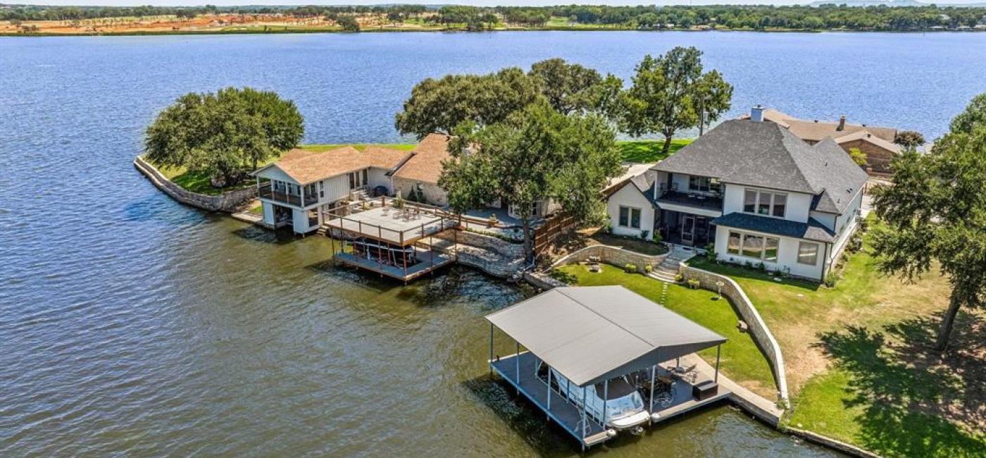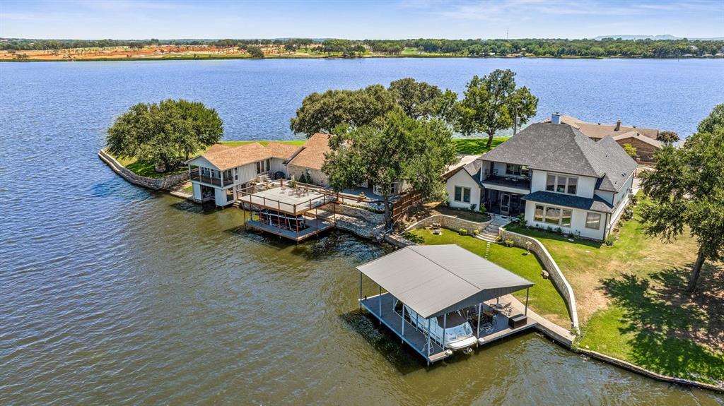 Experience luxury lakefront living with this exceptional custom-built home situated at the end of a serene peninsula. Inside offers a blend of elegance and comfort with high-end features throughout.Vaulted ceilings, marble and bamboo flooring and gas fireplace. The ample windows offer breathtaking lake views. The gourmet kitchen is a chef's dream, with a gas cooktop, double oven, large island, and granite countertops. The large primary suite features an ensuite bath with a jetted showpiece bathtub and a large walk-in shower. Enjoy your morning coffee on the screened patio or spend your days on the water with the large boat dock, which includes a lift and storage. Entertain in the family room, complete with a stained oak wet bar, sink, cooler, and keg tap. Enjoy the panoramic lake view from the composite-floored balcony. Utilize the additional storage area that can be finished as a 4th bedroom. Located just 4 miles from historic Granbury Square, offering shopping and dining options.