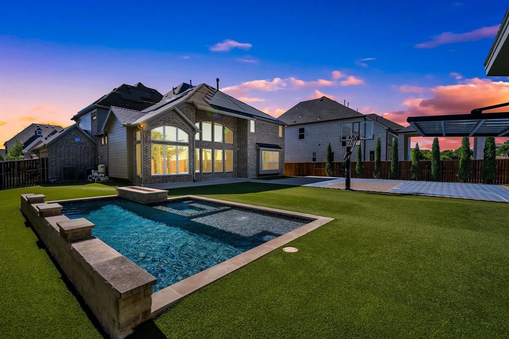 Welcome to this East facing stunning residence offering luxury upgrades and outstanding indoor-outdoor living in McKinney.This beautifully updated home features updated quartz countertops, a modern backsplash, 8-foot floating shelves, and custom wood paneling under the island. The dining area showcases a striking wine wall, perfect for entertaining. The office has been remodeled with a sleek glass entry, and the primary bedroom includes an upgraded California Closets system and enhanced lighting. The laundry room has been thoughtfully redesigned with custom shelving, a clothes hanging system, and a large wall cabinet for added storage.The home theater has been upgraded with a stylish glass wall, creating a true cinematic experience. Wood beams add character to the formal seating area, while fresh interior paint throughout enhances the home's modern feel. Five windows were removed to optimize the architectural flow and maximize natural light. Don't miss this opportunity! The spacious three-car garage features an epoxy-coated floor with decorative flakes, seven custom storage cabinets, and three ceiling-mounted storage racks for exceptional organization.Outdoor living is equally impressive: enjoy a refreshing swim in the swimming pool, shoot hoops on the basketball court, or plan for a future pickleball court. Entertain with ease in the outdoor kitchen under a custom patio cover, all set within an all-turf backyard accented by decorative landscaping rocks. Thirteen privacy trees create a serene, secluded retreat. The front yard also features refreshed landscaping, two new trees, and a concrete walkway extension to boost curb appeal. Energy efficiency is maximized with a Tesla solar panel system featuring four backup batteries, and the roof was recently replaced within the last two years for added peace of mind. Located in a sought-after McKinney community, this home offers a rare blend of high-end finishes, functional upgrades, and an incredible outdoor lifestyle.