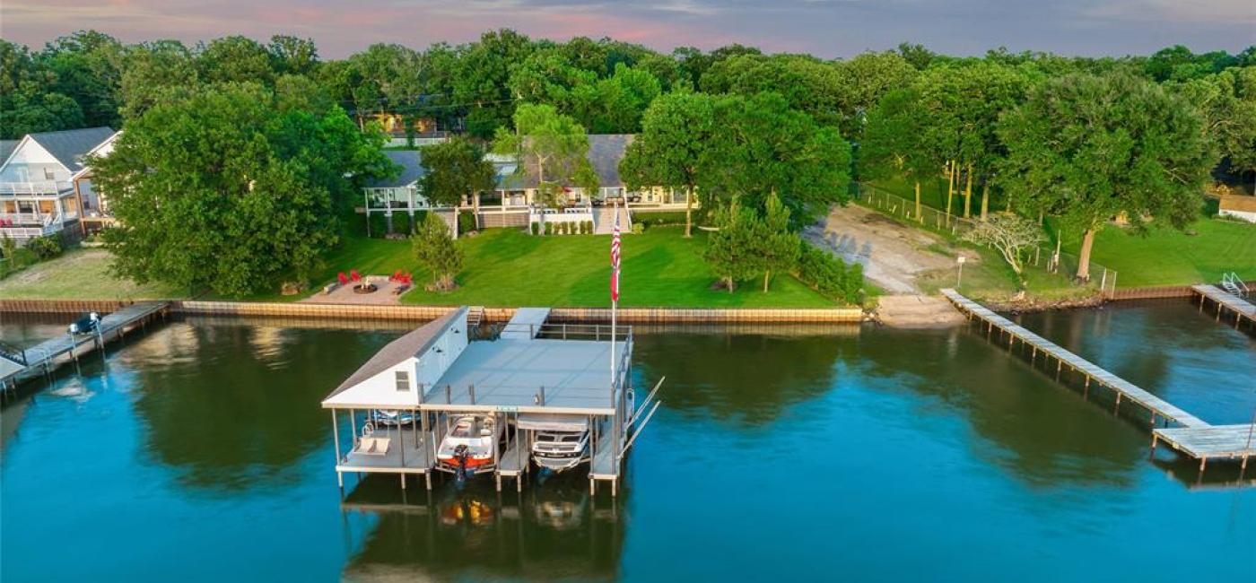Stunning double lot estate with main home and guest house totaling 3,165 sf on one-half acre with wide open water views and some of the deepest water you'll find on Cedar Creek Lake. This tastefully updated home gives modern, coastal vibes and has room to sleep and entertain a crowd. The main home has 4 bedrooms, 3 and 1 half baths, soaring vaulted ceilings, wood-burning fireplace, built-in bar with wine cooler, a sunroom that can double as a guest bedroom, full utility room, and walls of glass to the lake. The guest house, built in 2019, shares a deck with outdoor kitchen and includes a bunkroom and full bathroom, kitchen, and laundry. The large, updated boathouse has two boat slips - one is equipped with heavy duty, double cable, double motor lift system for your wake boat - double Sea-Doo lift, and plenty of storage for all your water toys. Extras include a touchless boat cover, spider misting system, sprinkler system from lake pump, golf cart garage, under deck storage with work bench and professional landscaping with outdoor lighting, and a beautiful firepit area at the water's edge to enjoy amazing sunsets.