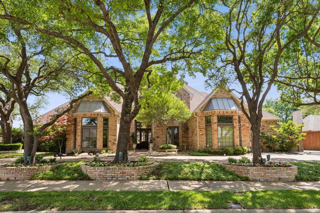 Stunning Willow Bend home with rare antique Chicago Brick exterior! Impressive entry welcomes with Murano chandelier imported from Venice, dramatic arched doorway and hand scraped hard wood floors. Expansive formal living area with wall of windows that overlook backyard oasis and floor-to-ceiling stone fireplace. Elegant dining room boasts Murano chandelier and butler’s pantry. Spacious kitchen has granite countertops, SS appliances, including double ovens, 2 Bosch dishwashers, & Subzero refrigerator. Generous storage with light wood cabinetry and walk-in pantry. Sunny breakfast nook overlooks sparkling pool with sleek chandelier and built-ins. Walk-in wet bar is perfect for hosting, with built-in wine fridge, cabinetry, and granite countertops. Roomy den is ideal for gatherings, with space for pool table and extra seating. Fireplace creates extra warmth and vaulted wainscoting ceiling adds extra style. Stately study offers wood built-ins, bay windows, and beamed ceiling. Connected full bath and closet allows for turning this space into additional bedroom. Enormous primary suite with wall of windows, fireplace, built-ins, and 85” Samsung Frame TV. Roomy sitting area with relaxing pool views and patio door makes for convenient access. Spa-like oversized primary bath with hydro tub, walk-in shower with rain shower head, 2 vanities with granite countertops, and 2 walk-in closets. Cedarwood sauna offers luxurious relaxation. Secondary bedrooms are perfect for extra office space or craft room. Roomy upstairs balcony offers lush greenbelt and pool views. Fully private outdoor sanctuary with spacious covered patio, spa & pool with diving board, and elegant pergola. Generous green space abounds with greenbelt and dog run. Extra features include solar panels, electric car-charging station, 2 tankless water heaters, Renewal by Anderson windows and northern exposure welcoming the winter sun and keeping out the summer heat. Close to high-end retail and Gleneagles golf course.