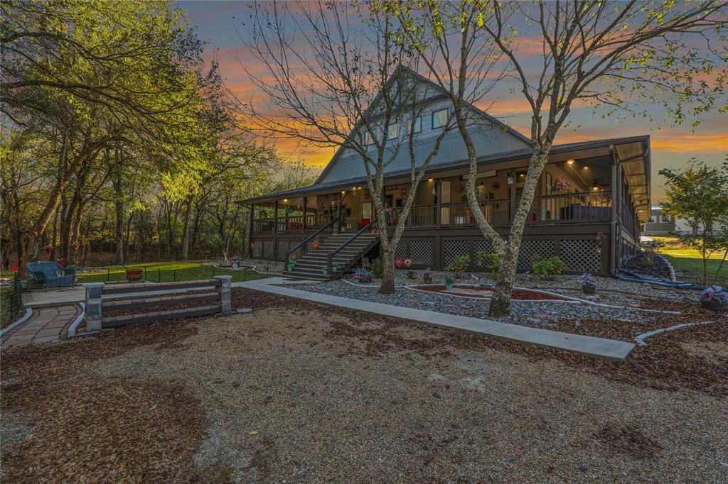 Everyday feels like a mountain vacation when you live in this Gorgeous, One Of A Kind Rustic Home in the Woods!! Over 3600 square feet inside, with lovely custom touches throughout. Handsome wood beams and stonework adorn the living room with a stone-hearth pellet stove and built in media cabinet. Beautiful stone arches give way to the open dining room and kitchen with Soaring 12 ft ceilings,custom cabinets,oversized island,stone flooring,induction cooktop and more! The Oversized primary suite features a cozy sitting area,window seat and stunning luxury bath. The Spacious upstairs suite has a main room that easily fits two full sized beds with a TV lounge and a full bath with dual vanities. Currently used as a game room, an optional 4th bedroom features a hidden walk in closet and bamboo floors. Outside, with over 2600 square feet of wrap around porch, you can find a breathtaking view any time of day! This exceptional home is situated on 4 heavily wooded acres of peace and tranquility. Cedar, Pecan, Oak and Pine trees have all been meticulously trimmed into a park-like setting. The property also features a 720 square foot detached garage with dual overhead doors and workshop space inside, perfect to store all your outdoor toys! You will have to remind yourself, we are not in the mountains, we are in Merit! Farmersville address in Hunt County, Bland ISD. The 4 acres will be surveyed out of the current 6.11 acres. This sale is subject to plat approval by Hunt County, owners have begun the process.