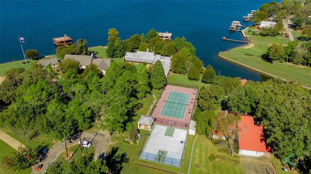 Exceptional Lakefront Retreat in Gated Community nestled on three premium waterfront lots. This remarkable property offers over 300 feet of shoreline, mature trees, and a rare sandy beach - a true lakeside paradise. Open concept layout featuring vaulted wood ceilings, concrete floors, and dramatic wall of windows framing expansive water views. The second living area is an entertainers dream with a stone fireplace, wet bar, game zone and comfortable lounge space overlooking the lake. Outside the sprawling covered porch runs the length of the waterside, flowing seamlessly into a spacious deck shaded by towering trees- perfect for relaxing or entertaining. The incredible double boathouse is outfitted with four PWC lifts, a covered gathering area space and a huge upper level sun deck. Sports enthusiasts will appreciate the private tennis court, dedicated sports court, and a mini putting green.