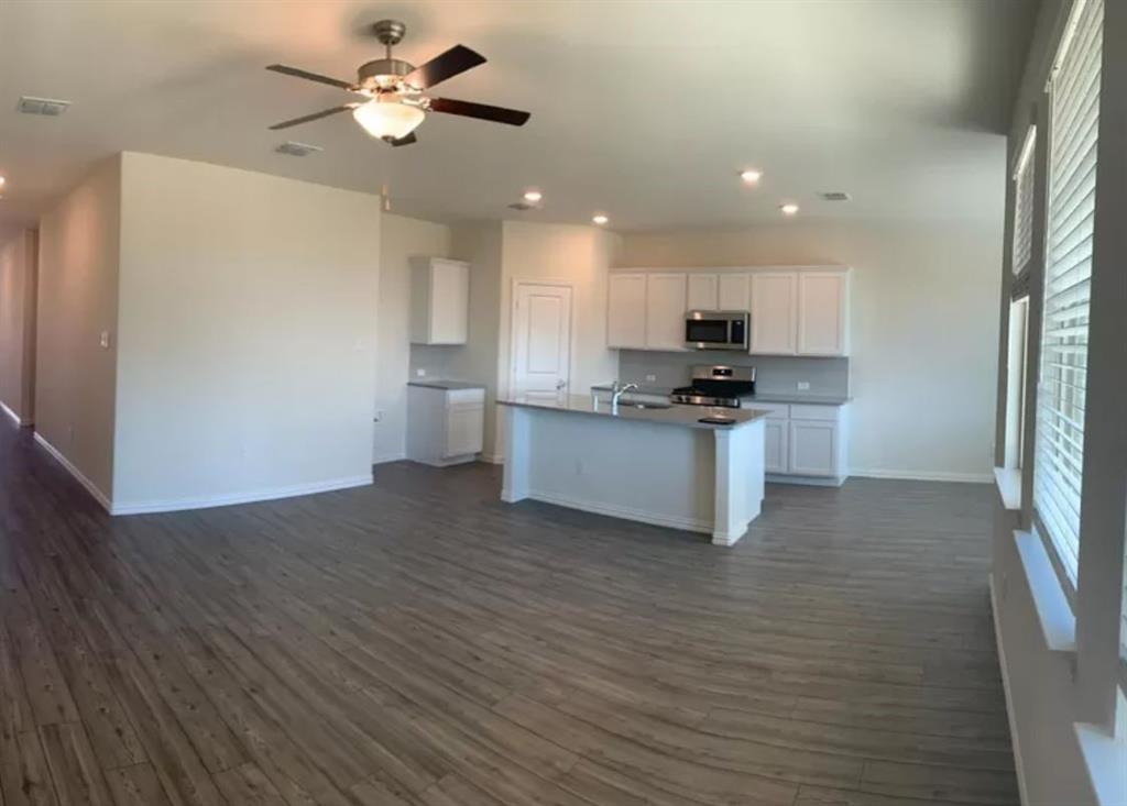 The highly coveted floor plan has an open concept kitchen with an island for storing cooking gadgets, plenty of modern light gray cabinetry and quartz counter top space with a light gray subway tile backsplash and coordinated gray, brown light Rigid Core Polymer plank flooring throughout the entire home. Plush stain resistant carpet in all bedrooms. The kitchen is open to the family room located near the breakfast nook and covered patio for entertaining or relaxing at home with family. Double vanity with quartz countertops in the owner's suite bath and enlarged shower with linen closet.