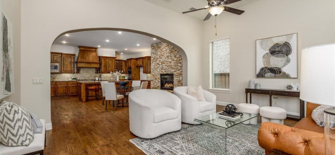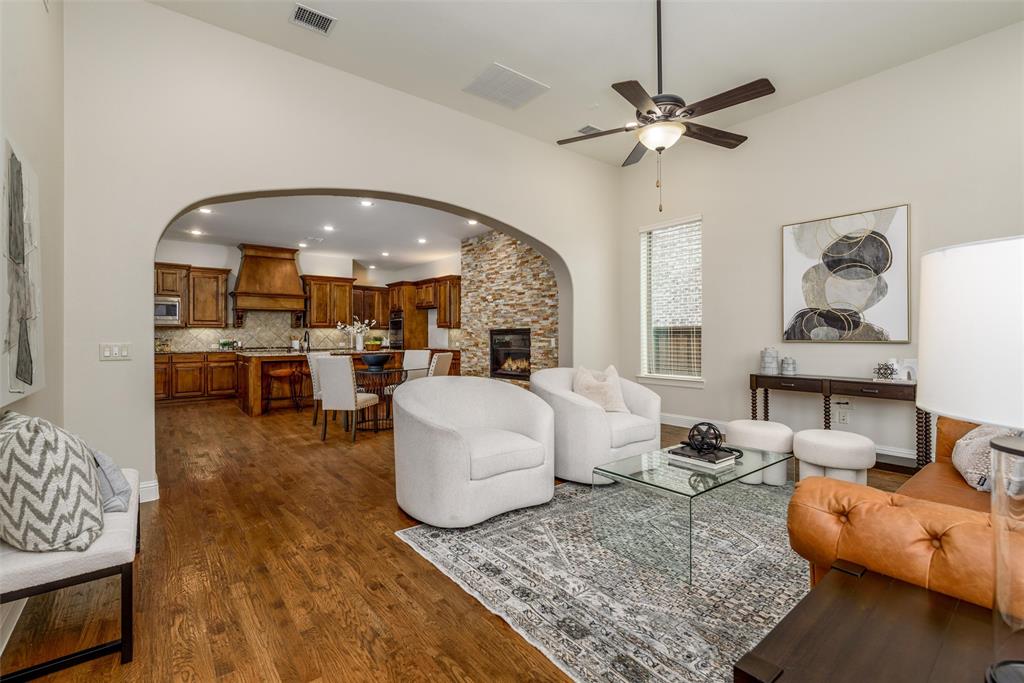 Welcome to this beautiful Darling-built home, located in highly sought-after Phillips Creek Ranch in Frisco. With fresh paint and new carpet throughout, this home is move-in ready and offers a perfect blend of modern comfort and timeless elegance. As you step inside, you’ll immediately appreciate the spacious, open-concept floor plan that’s ideal for both relaxing & entertaining. The living areas are filled with natural light and feature high ceilings, creating an airy and inviting atmosphere. The gourmet kitchen boasts stainless steel appliances, granite countertops, and a large island, perfect for preparing meals or gathering with friends & family. The dining area features a stone fireplace for ambiance and warmth and the family room is made for entertaining with built-in 5.1 sound wiring. Work from home with a great view of the backyard from the wall of windows in the office. 8 foot solid core doors and abundant hardwood floors. The primary bedroom suite is a true retreat, complete with a luxurious en-suite bathroom featuring dual vanities, a soaking tub, a walk-in shower as well as two closets, one of which connects to the utility room for convenience. Spacious secondary bedrooms offer flexibility: 1 is downstairs with ensuite bath and 3 are upstairs with 2 baths. All bedrooms have walk-in closets! Upstairs, entertain in the large gameroom and media room which is pre-wired for a 7.1 sound system and projector. Outside, enjoy the extended covered patio, ideal for outdoor dining, play, or simply unwinding after a long day. 3-Car Garage with overhead storage. This home combines convenience with luxury, offering easy access to Frisco ISD schools, shopping, dining, & entertainment venues. The premium location within Phillips Creek Ranch provides access to nearby Sheridan Park & resort-style amenities, including a clubhouse, fitness center, swimming pool, & miles of scenic walking trails. Don't miss your chance to own this stunning home—schedule a private tour today!