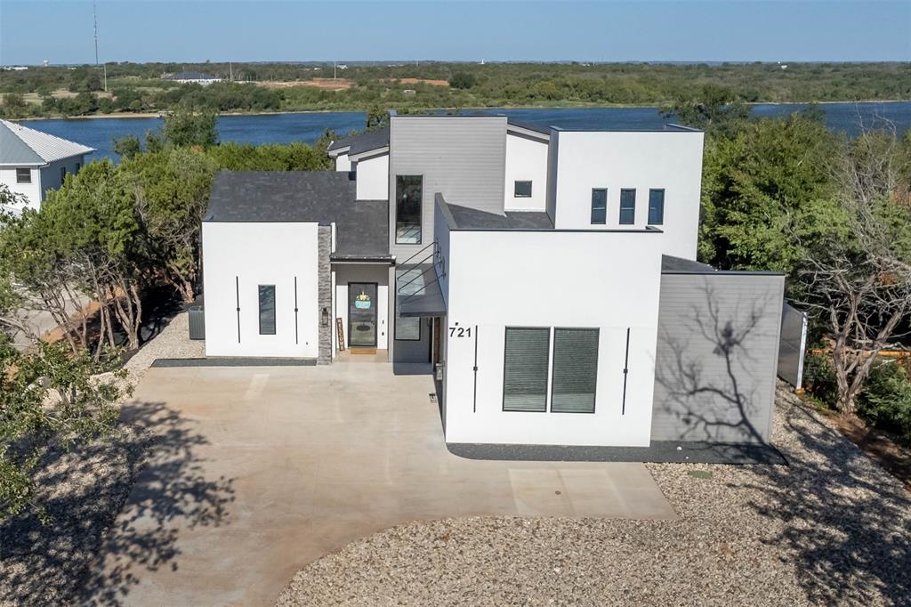 Beautiful Waterfront on the main lake. 2023 custom-built home has prized features loved by family and friends. ALL furniture and appliances convey. Upon entering one is met by a great living-dining room fashionably decorated, brightened by full windows and illuminated by unique, yet tasteful lighting. An open kitchen warmly welcomes the discerning chef and sports an island, a perfect place for both meal prep and socializing. Large walk-in pantry. Wood & ceramic tile flooring throughout. Classy 1st floor master bed-bathroom suite with BIG glassed-in shower, Texas-sized walk-in closet, exterior door to the covered rear patio. Massive, fun upstairs game-bedroom combo with dual queen-sized bunkbeds, plus two bedrooms with private baths. Opens to outdoor deck with circular staircase leading to lake trail, newer covered dock, boat-jet ski lifts. Close to Granbury Country Club. Oversized 2 car garage with 30 amp RV hookup. Energy saving features throughout. See virtual tour-videos!