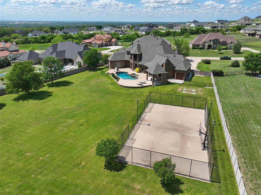 THINK OUTSIDE THE BANK, SELLER FINANCING AVAILABLE! (Ask agent for details) This breathtaking 1.76-acre estate offers nearly 6,000 sq. ft. of unmatched luxury behind the prestigious 24-hour gated and guarded Bella Flora community. Every detail of this home exudes character, from intricate coffered ceilings and elegant beams to hand-carved woodwork. Designed for grand entertaining, it features a stately library, a sophisticated wine cellar, castle-inspired vaulted ceilings, and a show stopping family room. Expansive double doors and sliding glass doors in the ballroom, living area, and primary suite seamlessly connect indoor and outdoor spaces, filling the home with natural light and showcasing breathtaking views of your private retreat. Upstairs, accessible via the main or private staircase, you'll find an additional living area with a built-in entertainment center, a private balcony overlooking the backyard, and three private suites, each with an en-suite bath and walk-in closet. The backyard is a true showpiece, featuring a pristine saltwater pool, hot tub, full-size basketball and tennis courts, and a well-equipped outdoor kitchen and living area. It is also the only home in the neighborhood with a full privacy fence! Need space for a boat or extra toys? The oversized four car garage easily accommodates them all with room to spare. Recent upgrades worth hundreds of thousands include a newer roof, flooring, water softener, water storage tanks, high end appliances, fresh interior paint, new windows and sliding doors, and much more. All TVs convey, see the upgrade list for details.