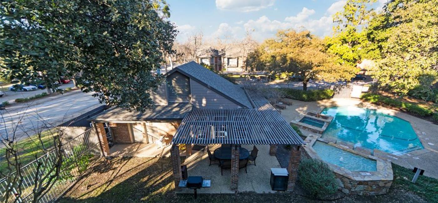 This gorgeous 1-bedroom, 1-bathroom condo near Lake Highlands in Richardson ISD boasts a stunning pool view right from your balcony! It features neutral paint, wood-like flooring, a cozy fireplace, and vaulted ceilings. The upgraded kitchen includes white cabinets, stainless steel appliances, granite countertops, and a sleek backsplash. The spacious master bedroom has two walk-in closets. The modern bathroom offers a large granite countertop and stylish shower tile. Relax on the private balcony overlooking the pool, hot tub, clubhouse, and trees. Extras include two indoor closets, an outdoor storage closet, and an in-unit laundry room. Located in the Woodlands on the Creek with easy access to highways 75 and 635, this condo is a must-see!