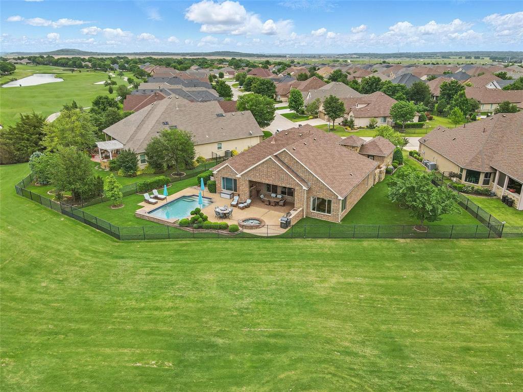 Situated directly on the 5th green, this luxury residence offers an unobstructed and expansive golf course view that make it one of the most sought-after homes in all of Robson Ranch! A true outdoor oasis, the huge backyard is an entertainer’s dream, boasting a magnificent swimming pool and separate spa, built-in barbecue, cozy fireplace and a large grassy area, perfect for furry friends. You’ll love the secluded courtyard entrance with its private casita complete with Murphy bed, mini bar, bathroom and walk-in closet. The effortless floor plan exudes an understated elegance with hardwood floors, plantation shutters and custom lighting. A lovely formal dining room with paneled walls and spacious den are oriented in the front of the layout, with a large open hallway that leads to the inviting living area. A graceful brick archway showcases the gourmet kitchen featuring quartz countertops, Monogram appliances, built-in refrigerator, butler pantry with dual zone wine refrigerators and large walk-in pantry. Windows abound to take in the breathtaking golf course views with no stray balls to worry about. The sunny nook is an ideal place to watch the golfers or simply gaze back toward the great entertaining space that is the true heart of the home. The primary suite exudes tranquility with an enormous double shower, deluxe sunken tub, dual vanities and walk-in closet that conveniently leads to the laundry room. Guests will enjoy a lovely en-suite room with French doors leading out to the main courtyard. A delightful three-car garage boasts LED lighting and epoxy flooring make storing a golf cart, vehicles and storage a breeze. Considered one of the best 55+ communities in North Texas, Robson Ranch amenities are limitless for those seeking an active adult lifestyle. Combined with its proximity to shopping, restaurants and DFW airport, this home is the crowning jewel to the lifestyle dreams are made of. Make it yours.